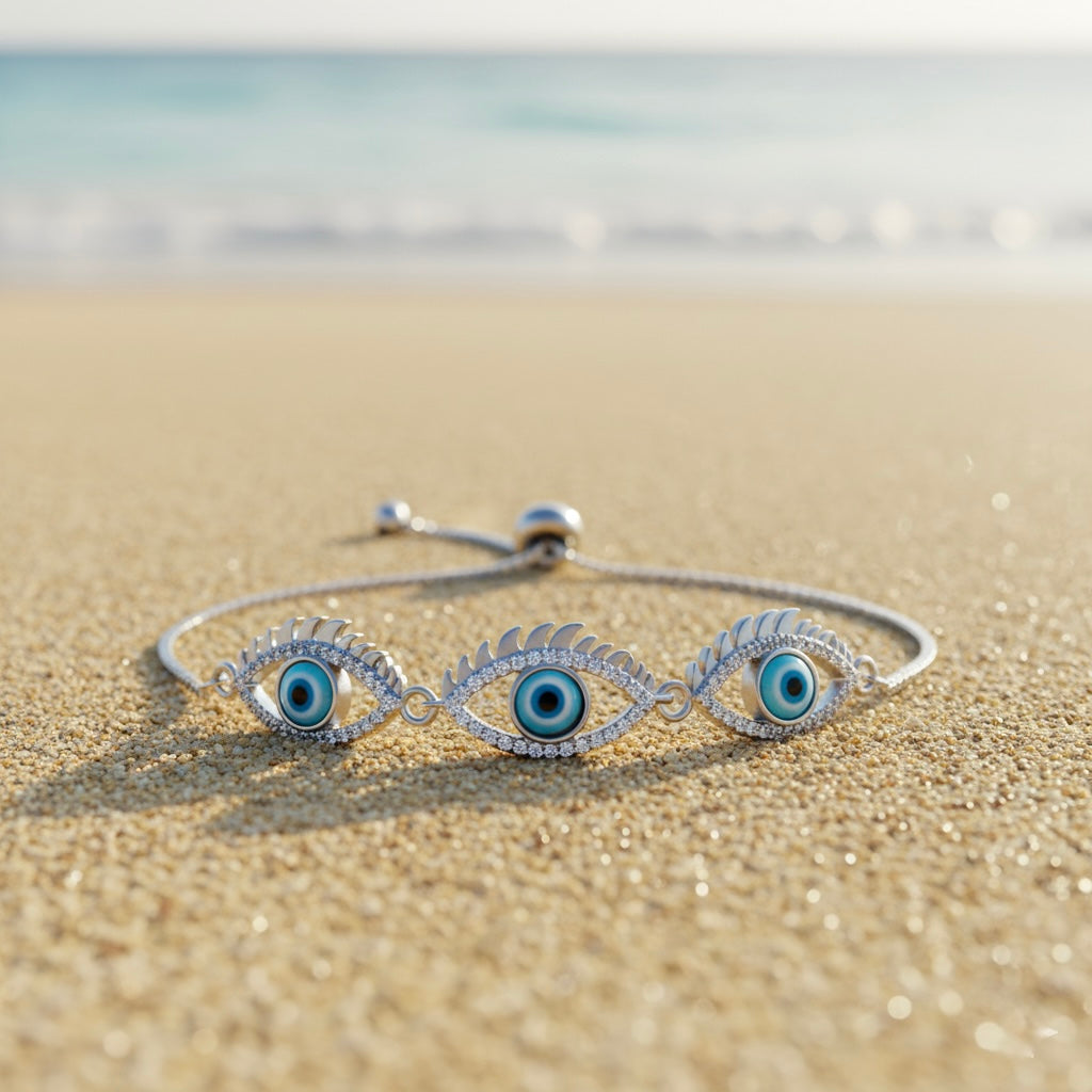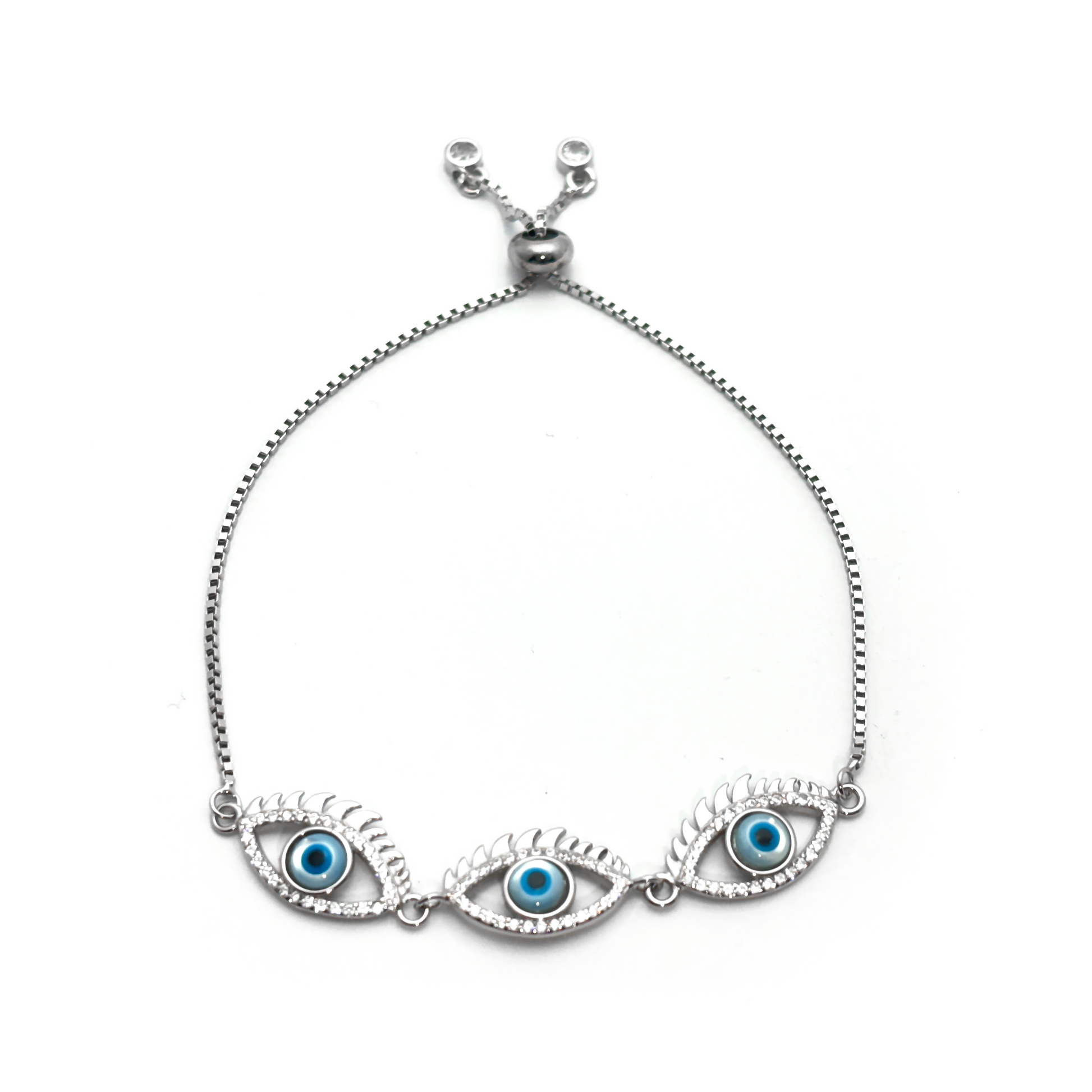 3 Blue Eye Charm & Studded Rhinestones Sterling Silver Chain Bracelet