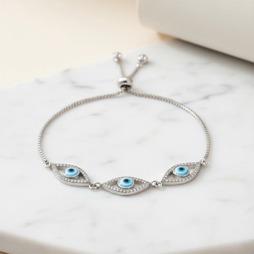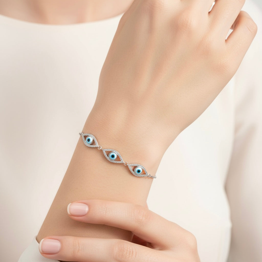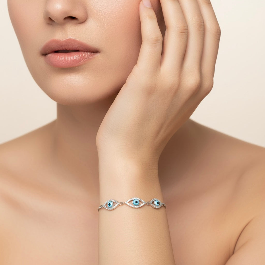3 Blue Eyes & Studded Rhinestones Sterling Silver Chain Bracelet