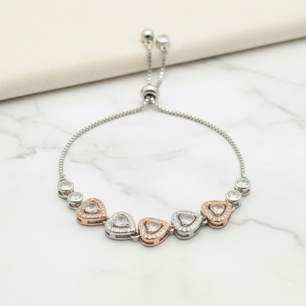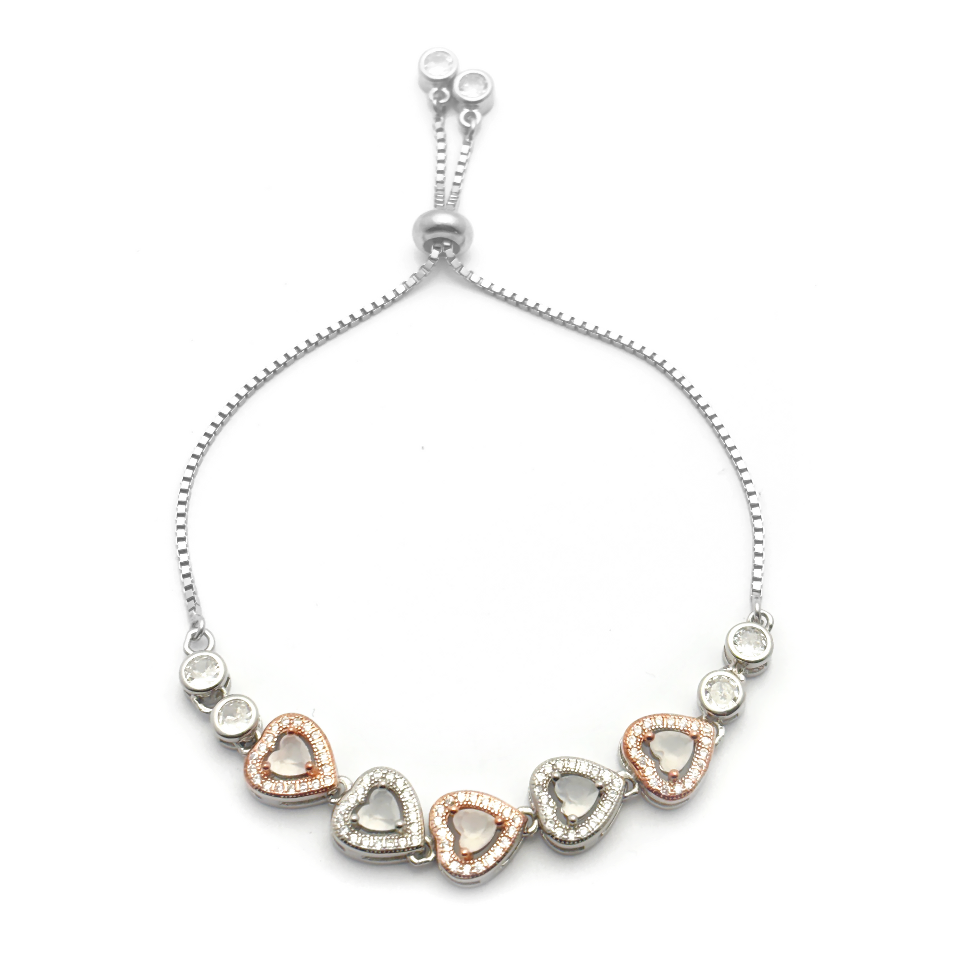 Heart Shape Charms & Studded Rhinestones Sterling Silver Chain Bracelet