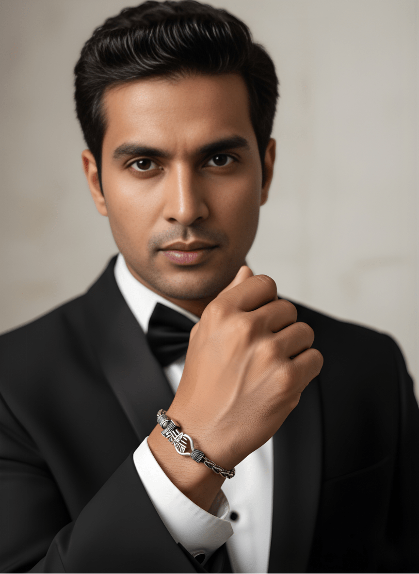 Elevate your spiritual style with our Silver Oxidised Mahakaal Bracelet, crafted in premium 925 sterling silver for the modern man who values strength, devotion, and timeless design. Featuring an intricately detailed Mahakaal emblem, this bracelet carries the fierce yet protective energy of Lord Shiva, making it a powerful accessory for everyday wear. The oxidised finish adds a bold, rugged appeal, while the durable silver chain ensures long-lasting shine and comfort. Whether worn as a statement piece or a symbol of faith, this bracelet perfectly blends spirituality with masculine elegance.