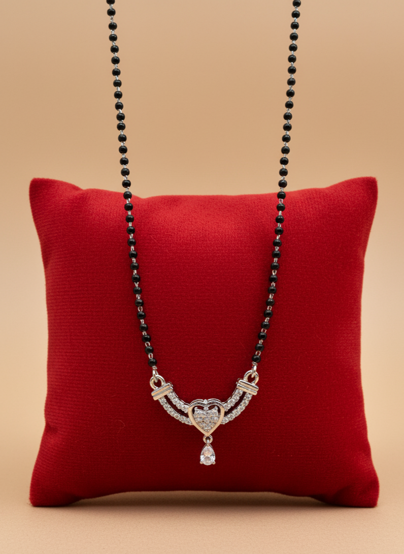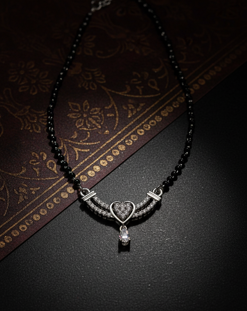 The Sterling Silver Eternal Heart Mangalsutra, expertly crafted from 925 sterling silver, combines timeless elegance with durability for everyday wear. This refined piece embodies love and commitment, making it an ideal gift to express your deep affection to your wife. Its sophisticated design ensures effortless grace, perfect for daily expression of your bond.